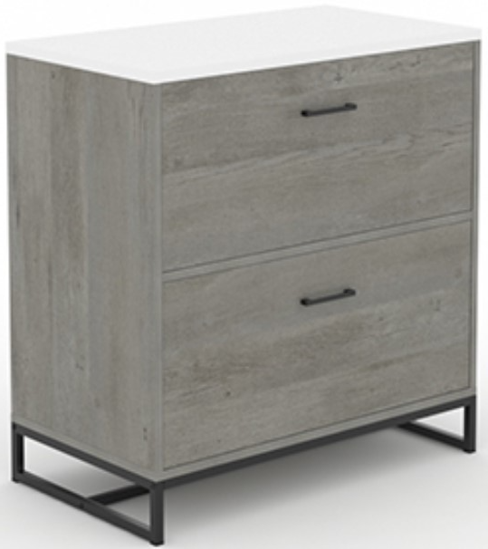 The interlocking safety mechanism of this 2-drawer filing cabinet allows only one drawer to open at a time to reduce tip over accidents. This filing cabinet features a spacious top surface that provides you with additional space for items like an accent lamp, home décor, and more. This office filing cabinet features a durable, powder coated metal base and is finished on all sides for versatile placement throughout your home. Finished in Mystic Oak® with White accent, this lateral file cabinet holds your documents in style.