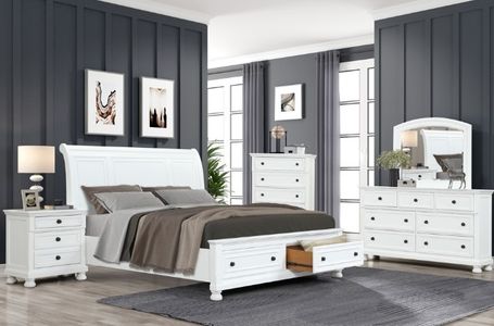 Add the combination of style and function with this eye-catching Charley Queen Sleigh Storage Bed. This sleigh bed includes a cut panel, swooping headboard with two footboard drawers. Crafted from wood veneer, and includes a platform base.En savoir plus