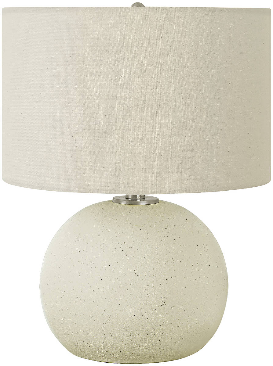 Brighten up your living room, home office, or bedroom with this chic globe shaped 18"H table lamp, with a textured cream ceramic base and topped with an ivory fabric drum shade for a contemporary appeal