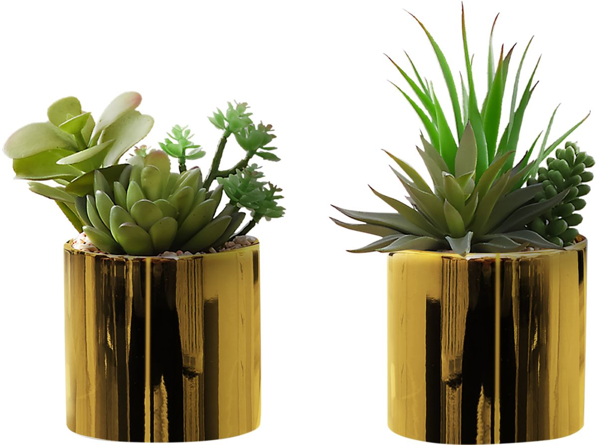 Set of 2 life-like, 7" tall artificial succulent plants in chic 3" glossy gold pots, top dressed with real pebble rocks.