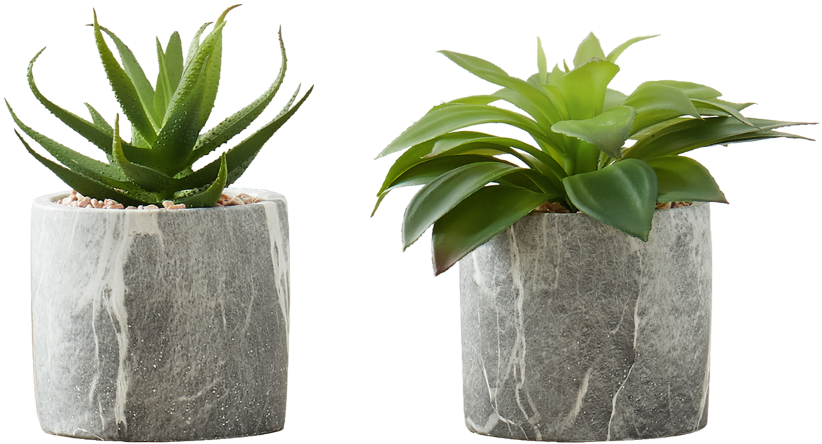 Each set includes two 7" tall faux succulents nestled in 4" grey marble-look cement pots with pebbles for an effortless realistic look