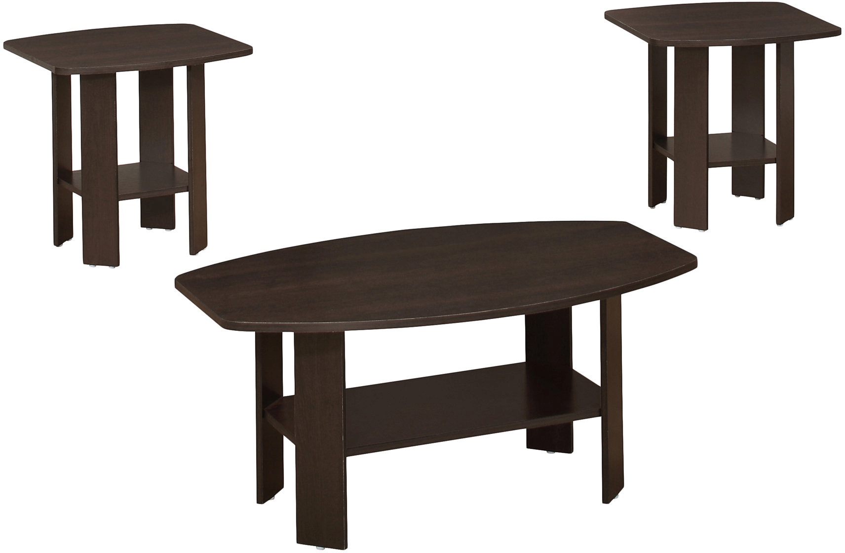 3-piece set includes 1 coffee table and 2 matching end tables with ample surface space and lower shelves for magazines, books, or other decorative items