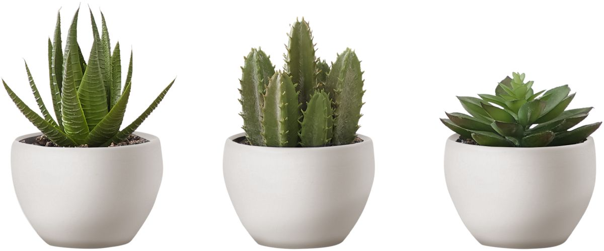 Add a touch of nature to your home or office with this set of 3 artificial succulent plants standing up to 6" tall. This sweet trio of faux green plants offer a no maintenance way to add some vibrancy to a room without the work. Our high-quality and durable decorative plants feature natural looking greenery that is hard to distinguish from the real thing.Read More