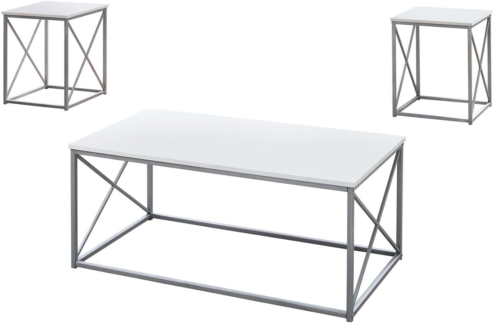 This beautiful 3-piece set will soon be the centerpiece of your living room. Including one rectangular coffee table and two end tables, the living room table set features a smooth white table top, brightening your living room decor like never before. Thanks to a rich silver metal X design frame that is super sturdy, the 3 tables will blend with just about any decor and they are perfect for photo frames, plants and other decorations.