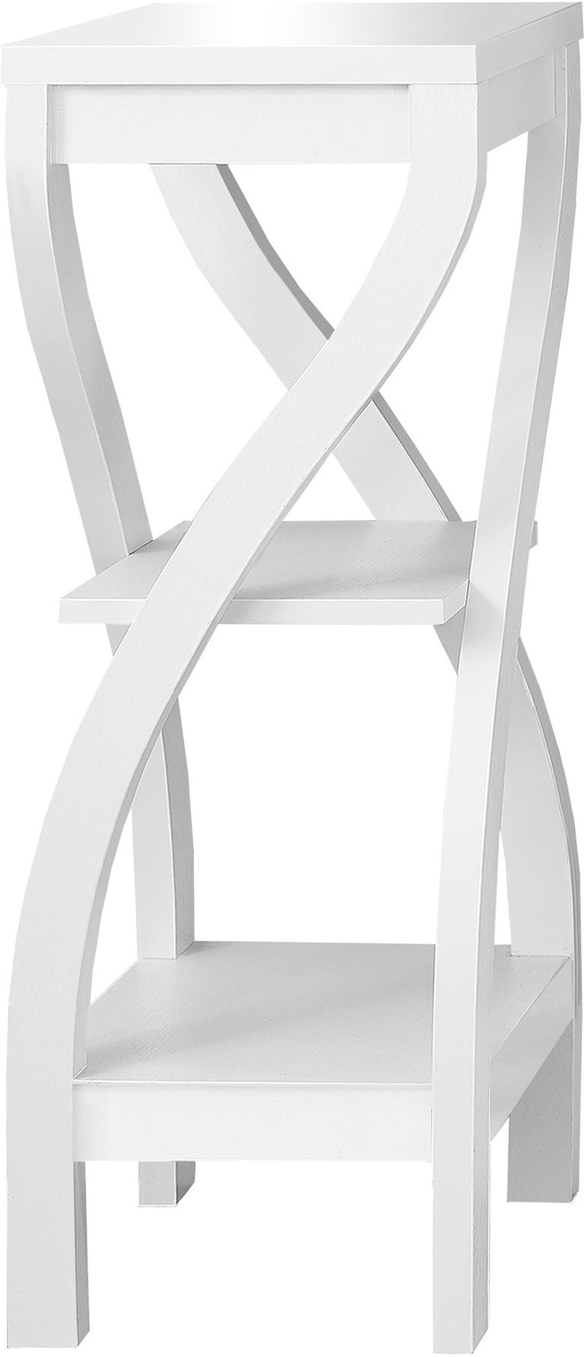 This innovative end table features a unique curved leg design in a thick panel composition for optimal sturdiness. Featuring a three-tiered design that provides plenty of surface space for use as a plant stand, for snacks, or other decor items, this accent table is designed to fit in any living room, entrance or bedroom. Use it to start a new decor style or to complement your existing look thanks to its versatile white finish.