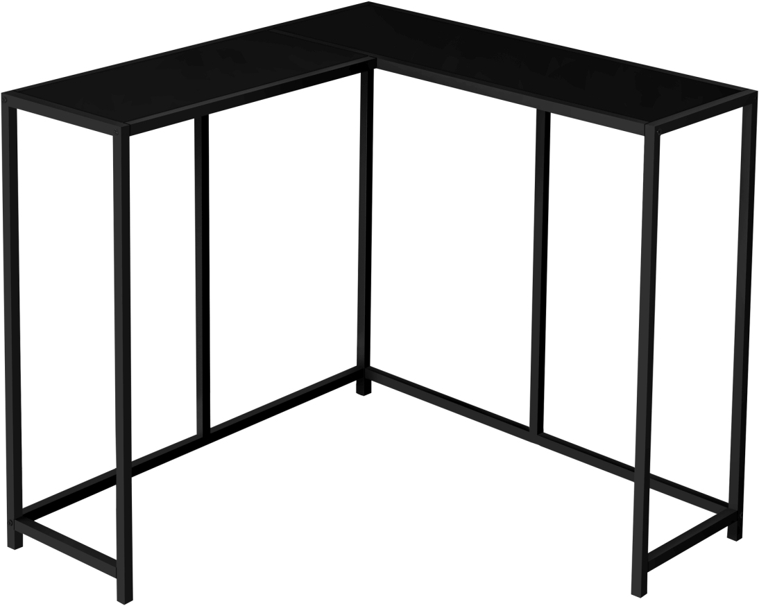 This accent table's L-shaped design takes up less room than triangular-shaped corner tables, making it an ideal choice for living rooms with limited space. Tabletop panels in a black laminate provide ample surfaces for displaying decorative objects. The slim metal frame in a matching black finish offers stability and has an open, airy design.