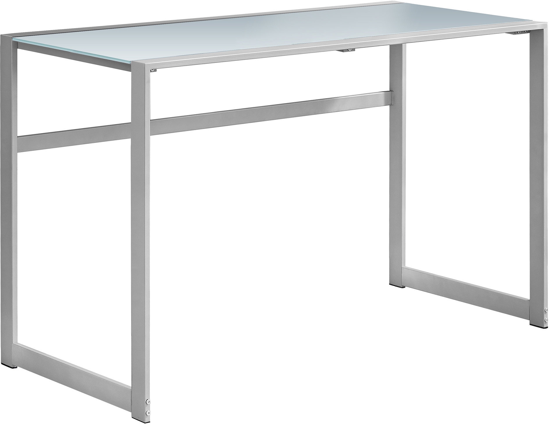 If you are looking to upgrade your work space then start with the sleek design of this simple, modern computer desk. The chic black tempered glass desk top is supported with strong metal u-shaped legs and a support bar across the back. With enough room to place a laptop, a lamp, office supplies, or a decorative object the compact size of this desk is also ideal for small spaces without sacrificing style. Assembly is required.