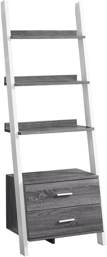 Adding a touch of modern style to your living space with this sophisticated etagere bookcase that includes tipping hardware for increased stability. The narrow ladder shelf format features four graduating open shelves and two convenient storage drawers equipped with sleek black metal handles to add an extra pop of style to your home decor. These ladder shelves make the perfect spot to store books, plants, photo frames and other around home essentials. Its black and grey finish gives it a stunningly unique appearance that is sure to grab the attention of your friends and family.