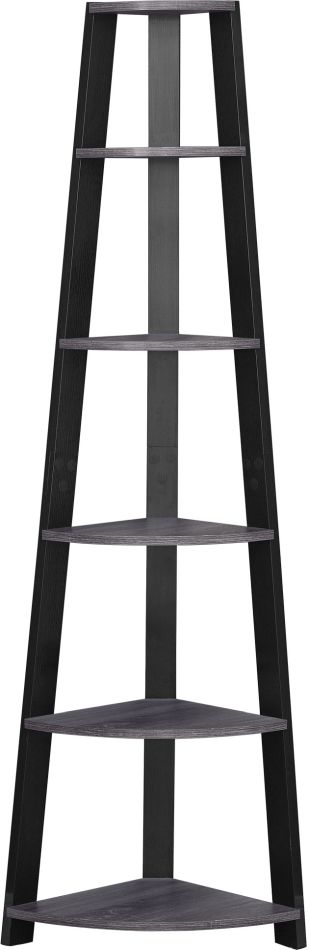 Set up this etagere bookcase easily and let it do its thing! Look how nice the grey and black wood look bookshelf fits in a corner of your living room, office or bedroom, allowing you to showcase books and all types of decor easily. Make use of a spot that is often tough to work with: the corner. Maximize storage and display with a modern piece that will be sure to help you utilize all the space available to you thanks to 5 fixed tray style shelves. Three sturdy beam legs ensure structural integrity to this corner ladder shelf. Anti-tipping hardware is included for further stability.