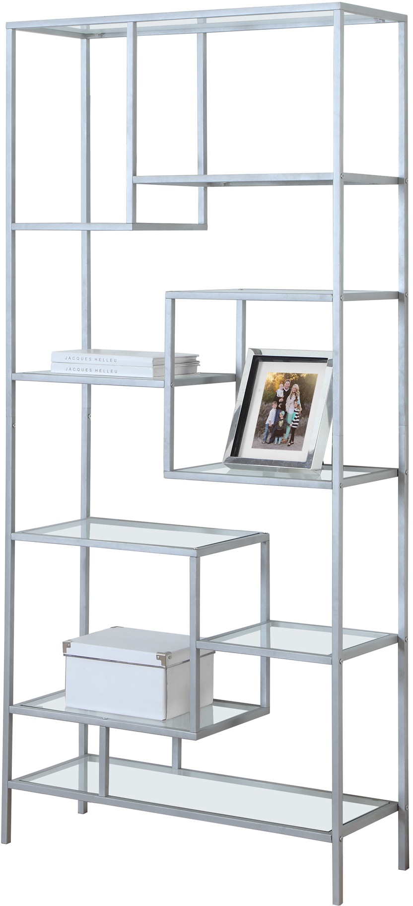 Show off your decorative items in style: plants, photo frames, books or even electronic devices thanks to this bold silver metal etagere bookcase simply made to impress. With nine tempered glass asymmetrical shelves, the backless bookshelf's design blends perfectly in your living room, office, bedroom or entrance area of any small home, condo or apartment where space is limited. It's the perfect accent piece to maximize space!