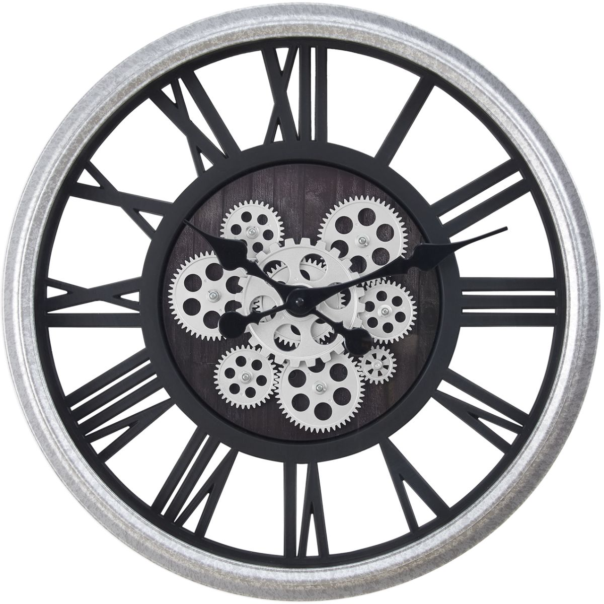 Features a unique moving gear mechanism in silver with black metal hands against a printed backdrop and quartz movement for accurate timekeeping.