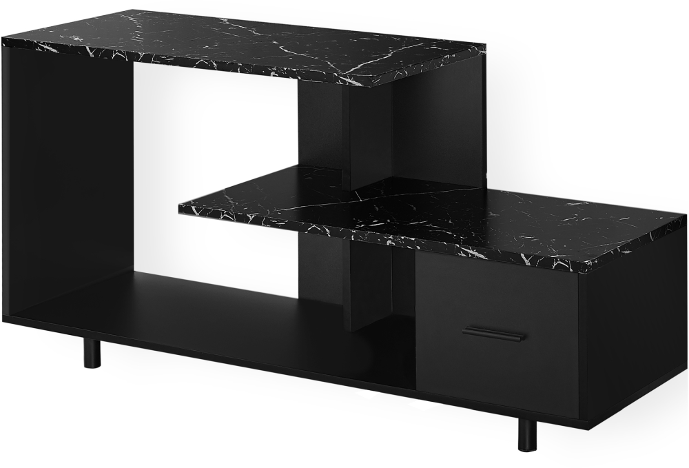 Enhance the look of your living space with the contemporary styling of this Art-Deco inspired tv stand. This black with black marble top entertainment console with sturdy round metal legs, features open concept shelving and one drawer ideal for media storage solutions.Read More