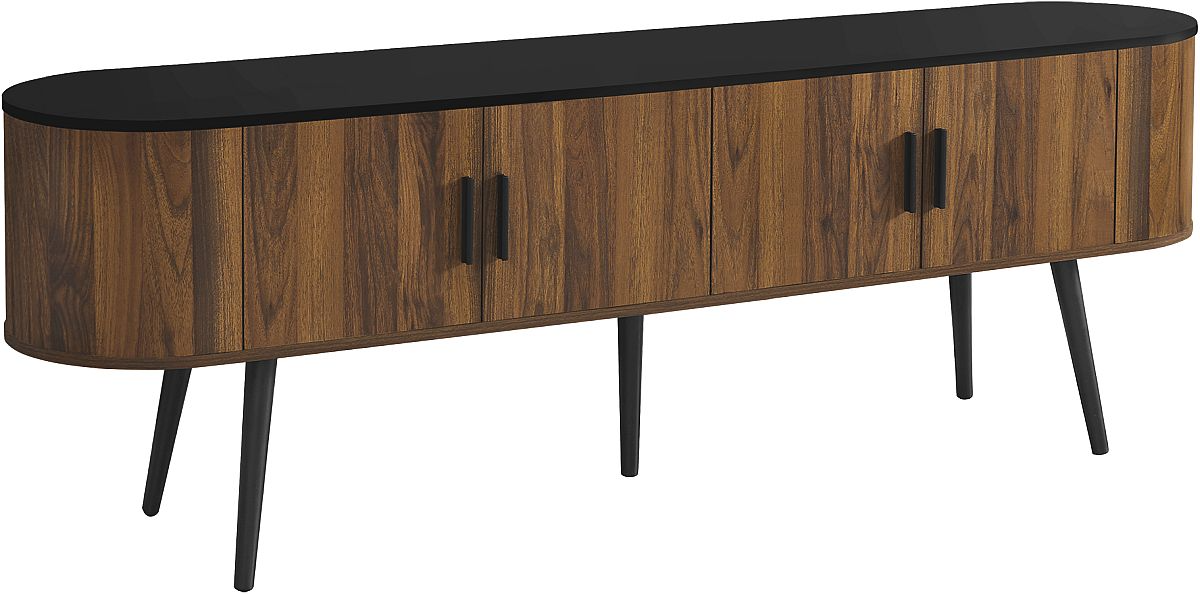 This console features a two tone design with a smooth black laminate finish on the easy to clean top and a wood-look walnut laminate on the 4 doors of the cabinet with sleek handles in black, adding a touch of retro style to your home decor. Keep your living room organized with spacious storage cabinets and two hidden cable management holes to keep unsightly wires out of sight. The curved sides bring a contemporary and mid-century flair to this tv stand, making it the perfect addition to your bedroom or living room. Not only is this tv stand easy to assemble with illustrated instructions, floor protectors, and all hardware included, but with closed storage options, you can now keep your media entertainment center neat and tidy in fashionable style. Plus, with a 5 year limited warranty, you can trust that this tv stand is built to last.