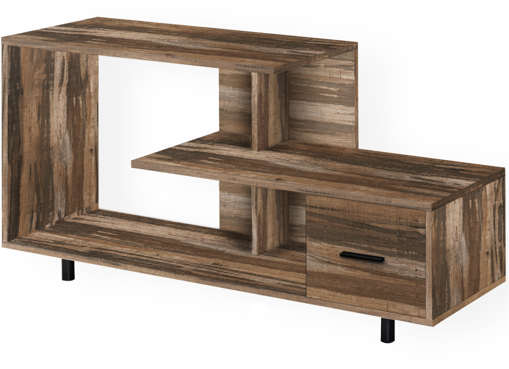 Enhance the look of your living space with the contemporary styling of this Art-Deco inspired tv stand. This medium brown recovered wood-look entertainment console with sturdy round metal legs, features open concept shelving and one drawer ideal for media storage solutions.Read More