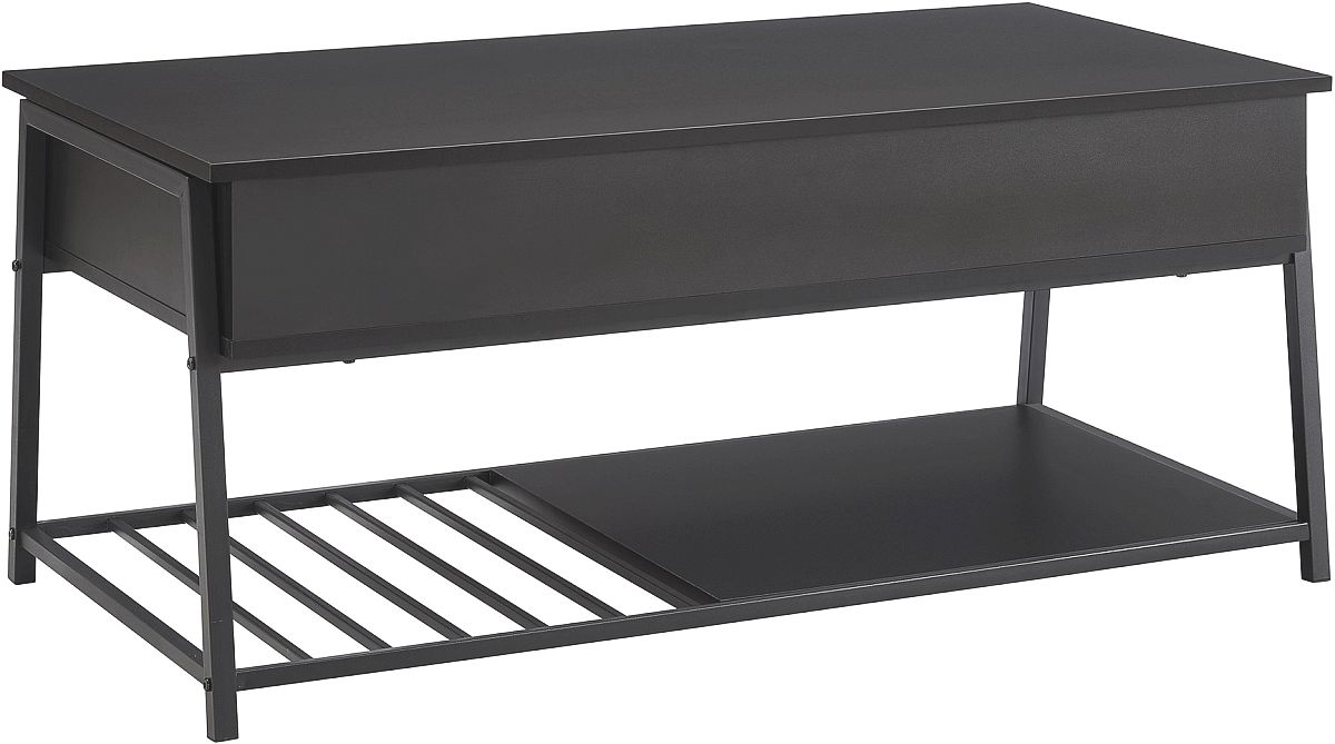Crafted with a durably designed black laminate top and a sleek black metal base, this rectangular coffee table offers a convenient lift-top feature that effortlessly transforms into a stylish workspace, perfect for enjoying coffee while catching up on emails or indulging in a snack during movie night.Read More