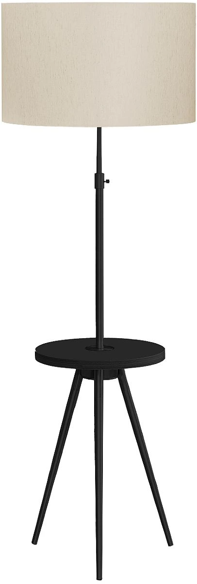 Bring some effortless ambiance to your living space with our sleek and modern 66" h tripod floor lamp in black metal with a built-in black laminate shelf and topped with a drum shaped linen ivory fabric shade.Read More