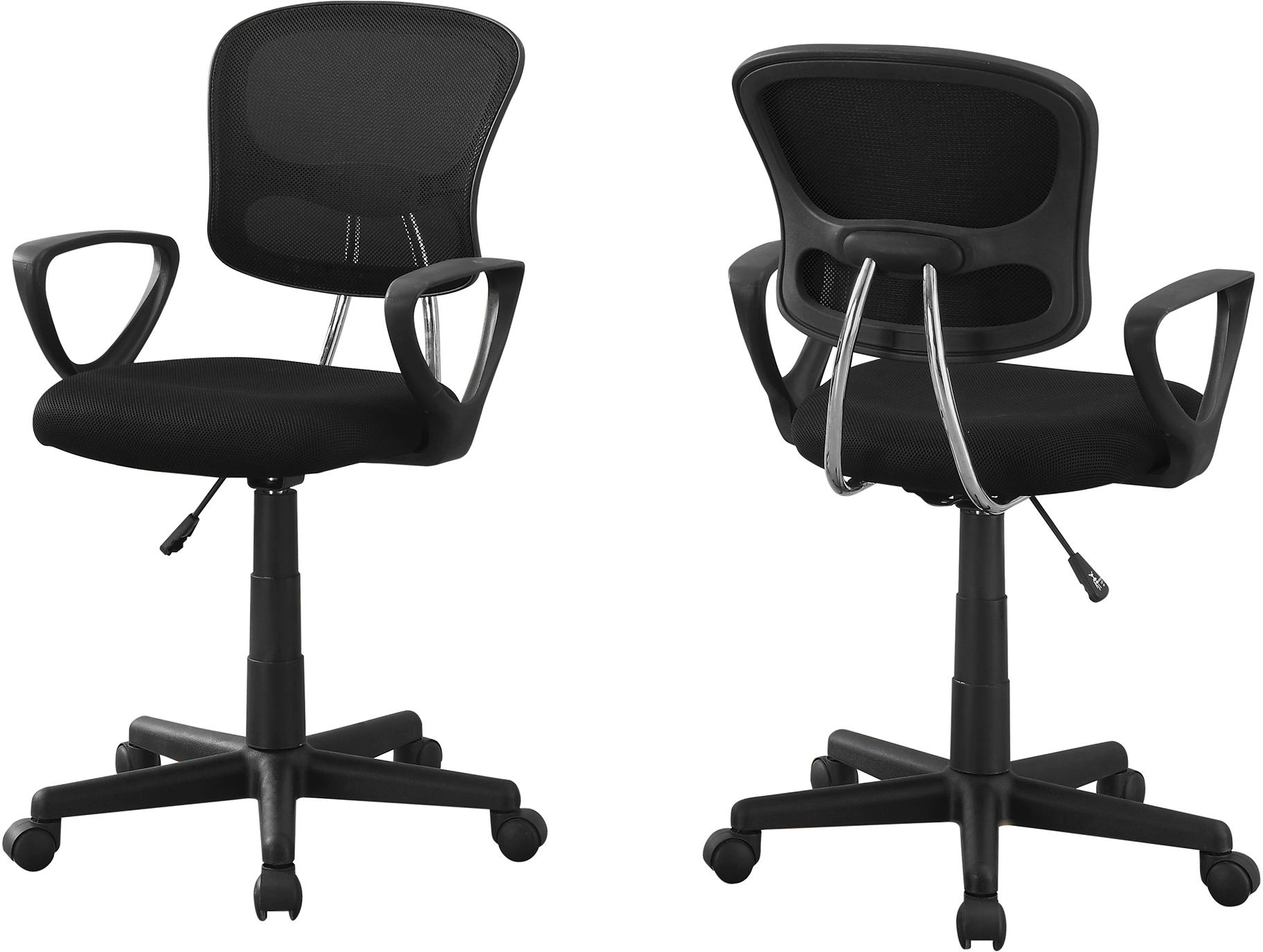 Upgrade your study/work space with this modern ergonomically designed mid-back juvenile office chair in a classic black finish. BIFMA certified, this stylish and supremely comfortable chair has a supportive natural curved back, a thick cushioned seat upholstered in a durable and breathable commercial grade black nylon mesh fabric, with high quality finish black arm rests. The convenient side lever allows you to easily adjust the seat height between 17"-21"high, and the 5 nylon hooded castors on a sturdy base gives smooth mobility across a floor or low pile carpet. Easy to assemble, you deserve to be sitting comfortably and in style as you work hard to finish those school projects!