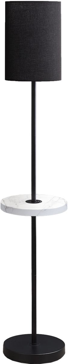 Illuminate your space with our chic and contemporary 62"H floor lamp with a convenient built-in shelf table. Crafted with sturdy black metal with a circular metal base with a white marble-look metal shelf table, and topped with a tall drum fabric shade for a modern and luxurious look in your living room, bedroom, or office. This decorative floor lamp with a USB port included on the shelf table to easily set your device for re-charging.Read More