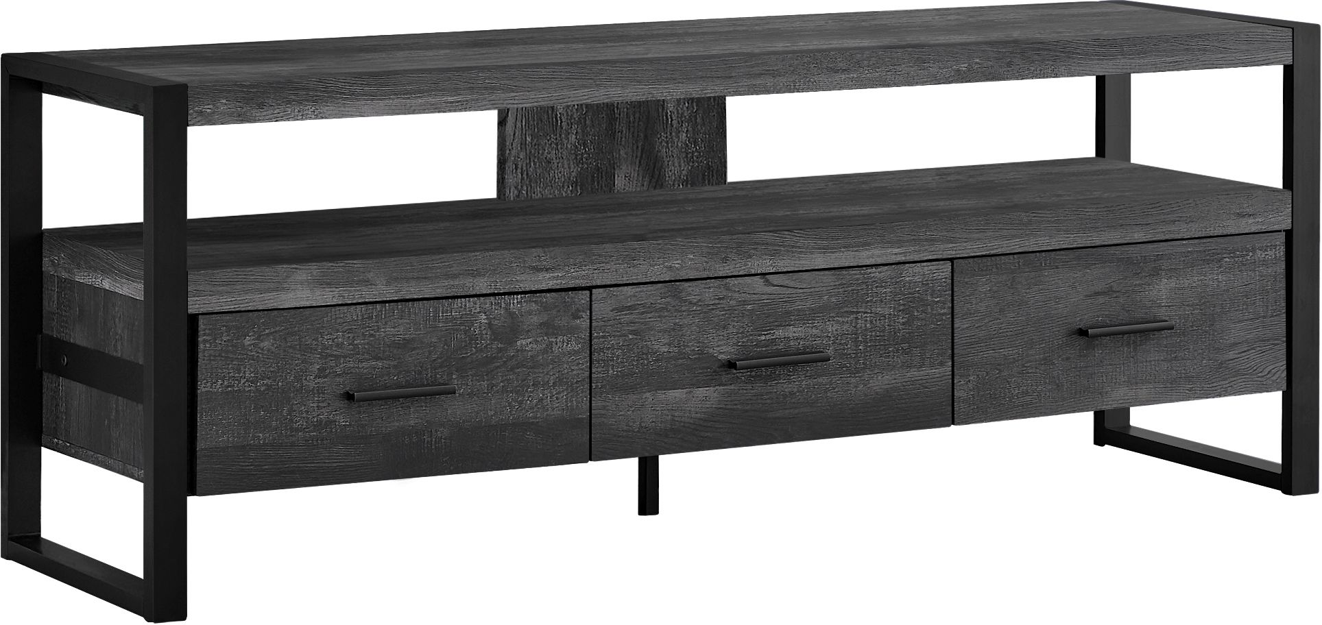 Bring an industrial-inspired style to your entertainment space with this low-profile open back TV stand. The bold design starts with strong black satin metal supports at each end and in the center, with thick paneled 60-inch long shelving that can hold any size TV once centered. Finished in an elegant black reclaimed wood-look, this TV stand features a long open shelf to place your audio/visual equipment or a sound bar. The three closed drawers on smooth metal glides, are accented with sleek black handles, roomy enough to store all your accessories, keeping everything organized in one place but out of sight. Assembly is required.