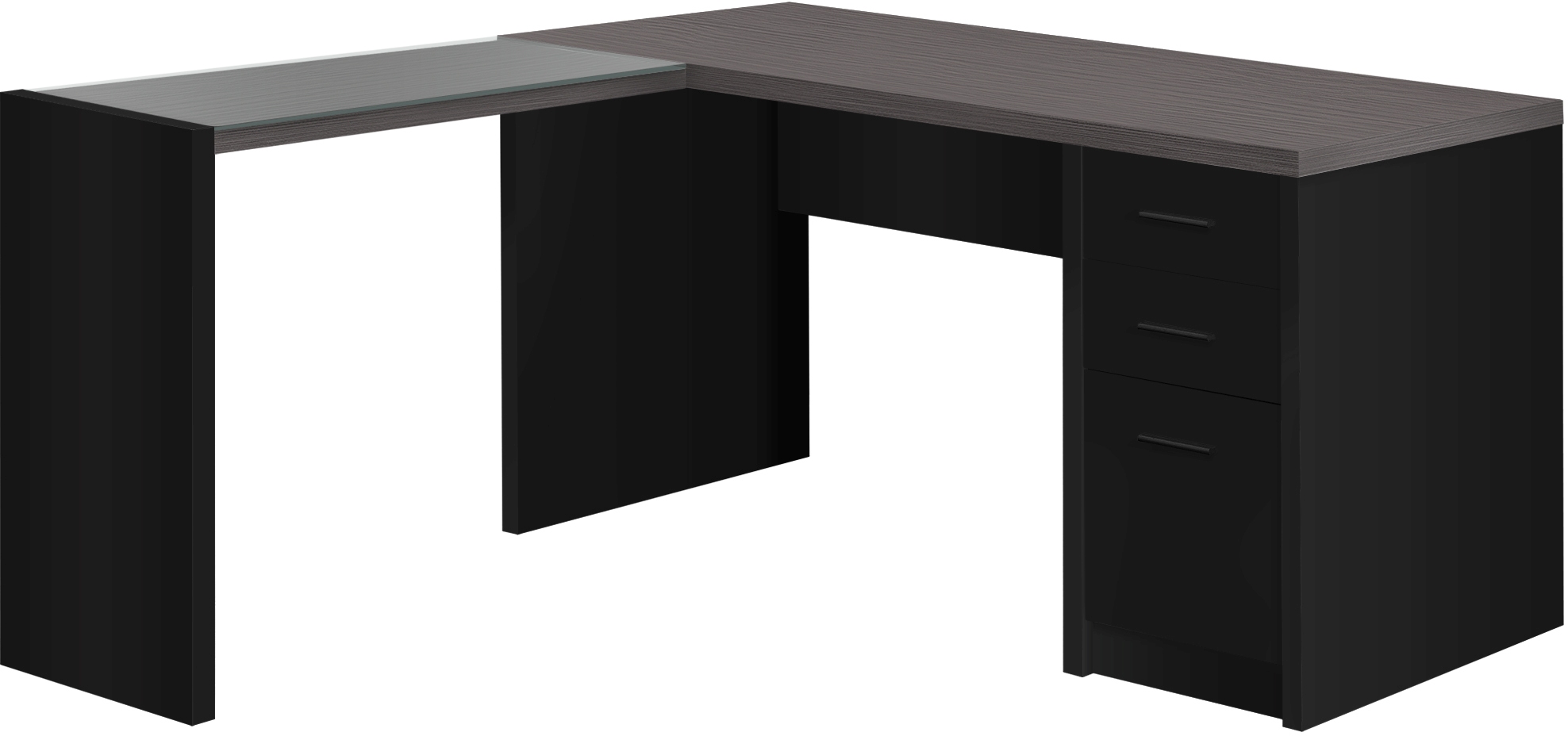 Upgrade your home office with this contemporary style L-shaped corner styled desk with an expansive desk top, finished in a stylish black and grey wood-look on all sides. The desk portion provides 3 convenient storage drawers for your office supplies and paperwork, including a file cabinet fitted for legal sized folders. The handy side table is partially topped with a piece of 5mm thick tempered glass which not only protects the desk surface, but gives it that extra luminance. Whether you place in a corner or in the middle of the room, this clean lined desk with thick paneling will be a stand-out in any area. Assembly is required.