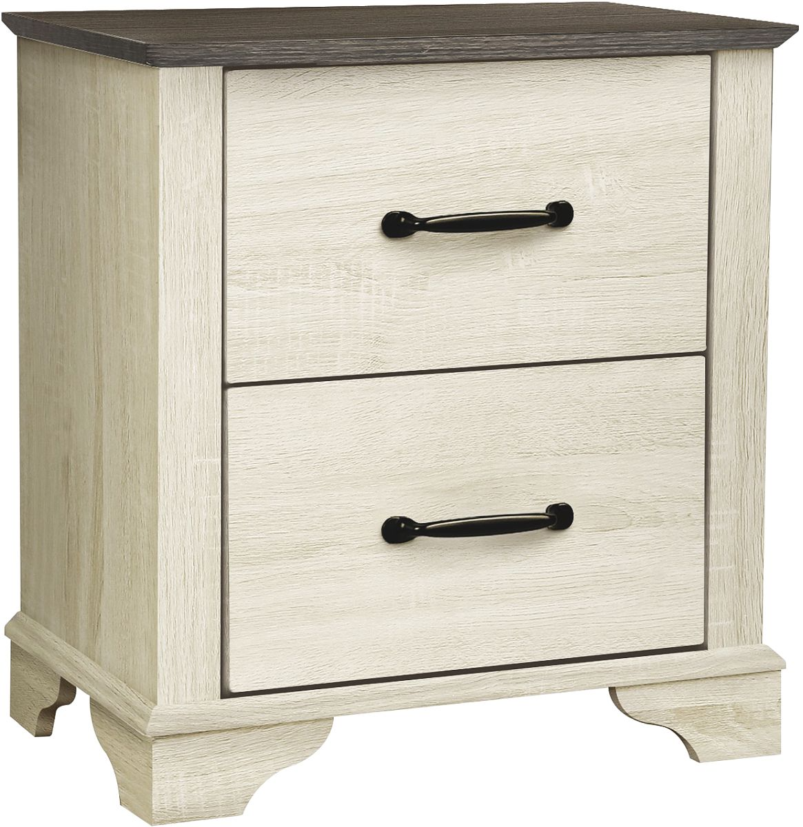 This transitional style two-drawer nightstand features a warm bleached oak finish with a smooth, dark brown oak laminate top, perfect for modern bedroom spaces