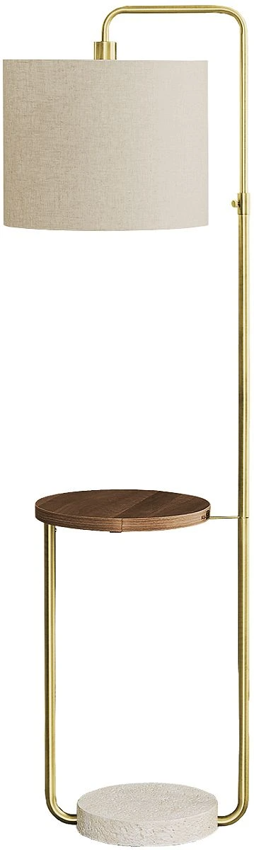 Elevate your space with the ultimate combination of style and functionality with our 67" h floor lamp in brass metal with a linen beige shade. The handy built-in shelf in a walnut laminate finish has a usb port included to easily hold and charge your devices.Read More