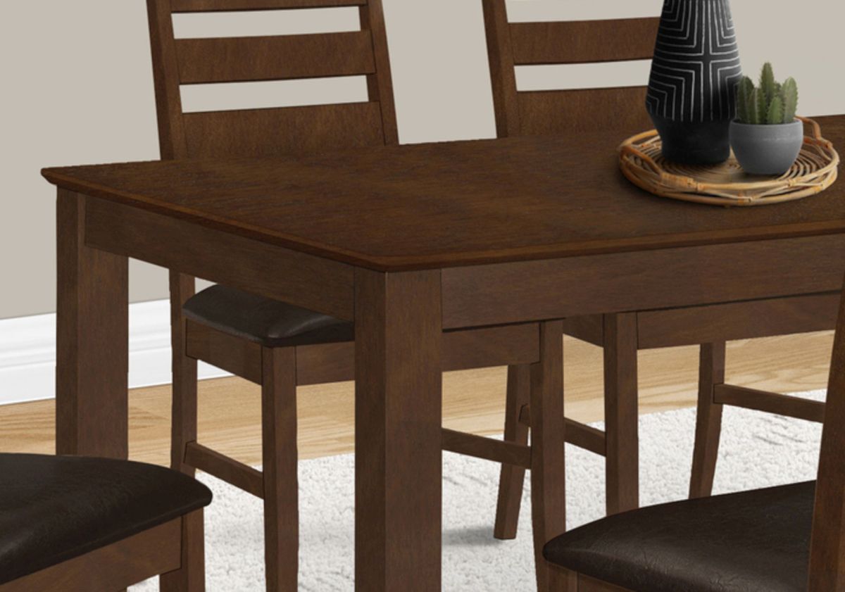Bring fashionable style to your dining room or kitchen with this durably designed 60" rectangular dining table in a chic brown veneer finish. Perfect for casual family dining, it table offers plenty of room for the whole family to gather and enjoy meals together, with seating up to 6. The easy to clean top makes it a breeze to maintain and full illustrated instructions are included for a quick and easy assembly in time for your next meal! The transitional style in the neutral brown finish and solid wood legs, adds a sophisticated look to both formal and casual decors.Read More