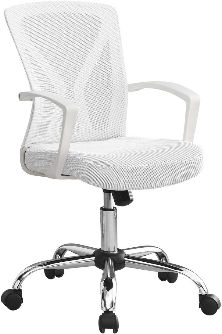 White mesh fabric that allows air to circulate covers the swivel seat and backrest. The backrest exterior features supports that are both decorative and functional. These supports add visual interest and can be used as handles when you move this adjustable-height chair that has a chrome five-star base with casters for mobility. Ideal for smaller spaces, this chair will bring streamlined style to your office.