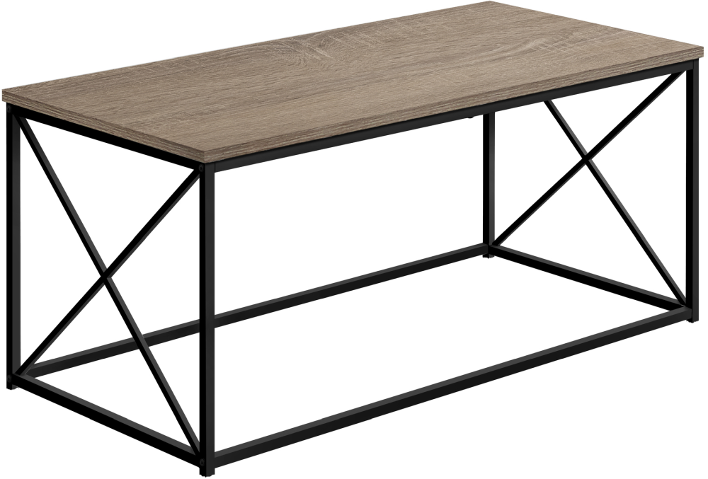 Featuring a smooth modern dark taupe wood-look table top finish which will brighten up your living space, while the X shaped black metal legs contrast and complement the table top.