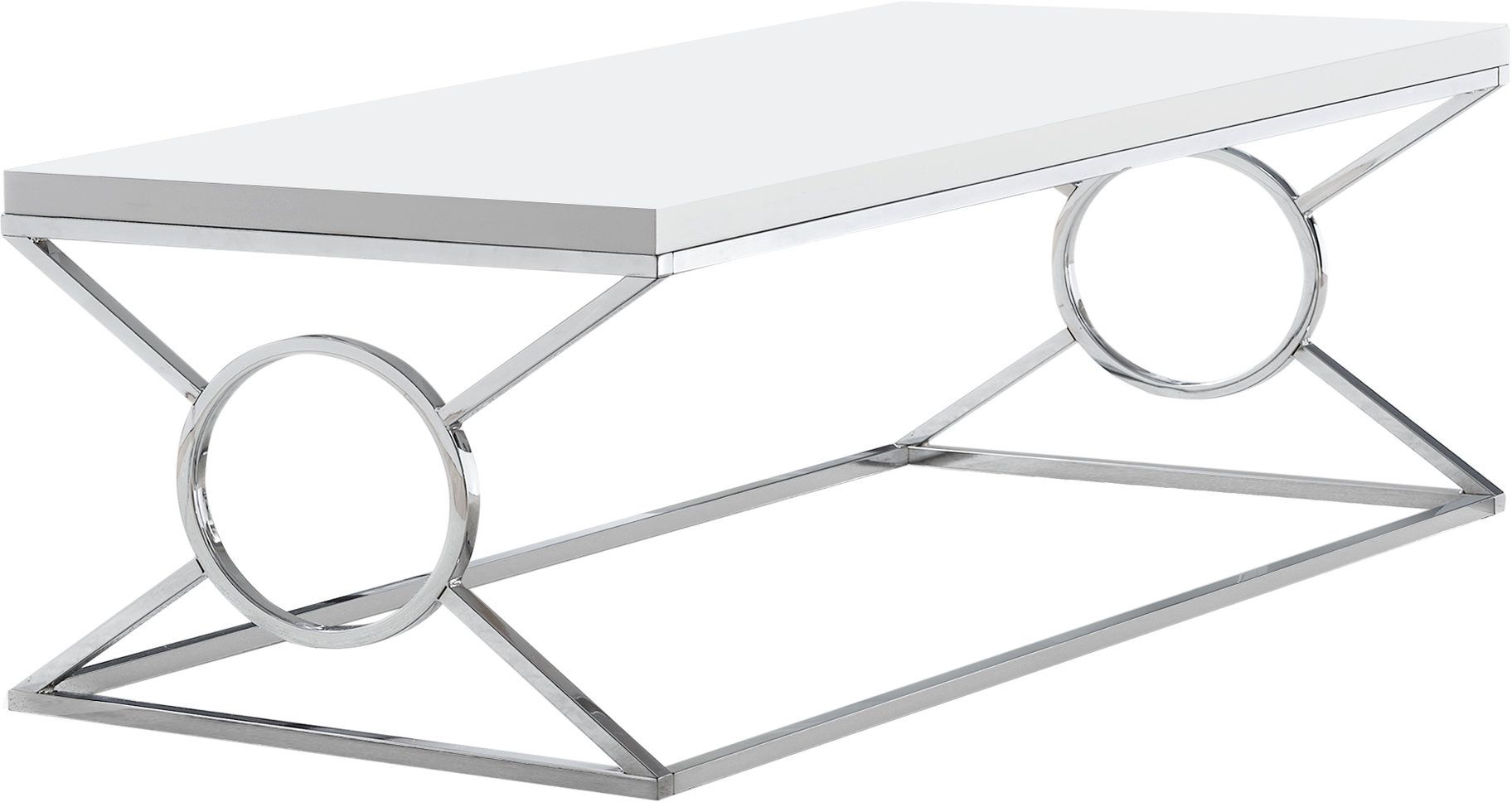 If you need a statement piece to anchor but not overwhelm your living room, then this coffee table with a contemporary twist will fit in nicely. The thick glossy white rectangular tabletop is spacious enough to rest a tray, hold some magazines or a decorative object. The chrome metal base with a unique circle intersected by an X leg design and solid base gives it a fashionable appeal. The classic lines of this coffee table will suit most decor styles. Assembly is required.