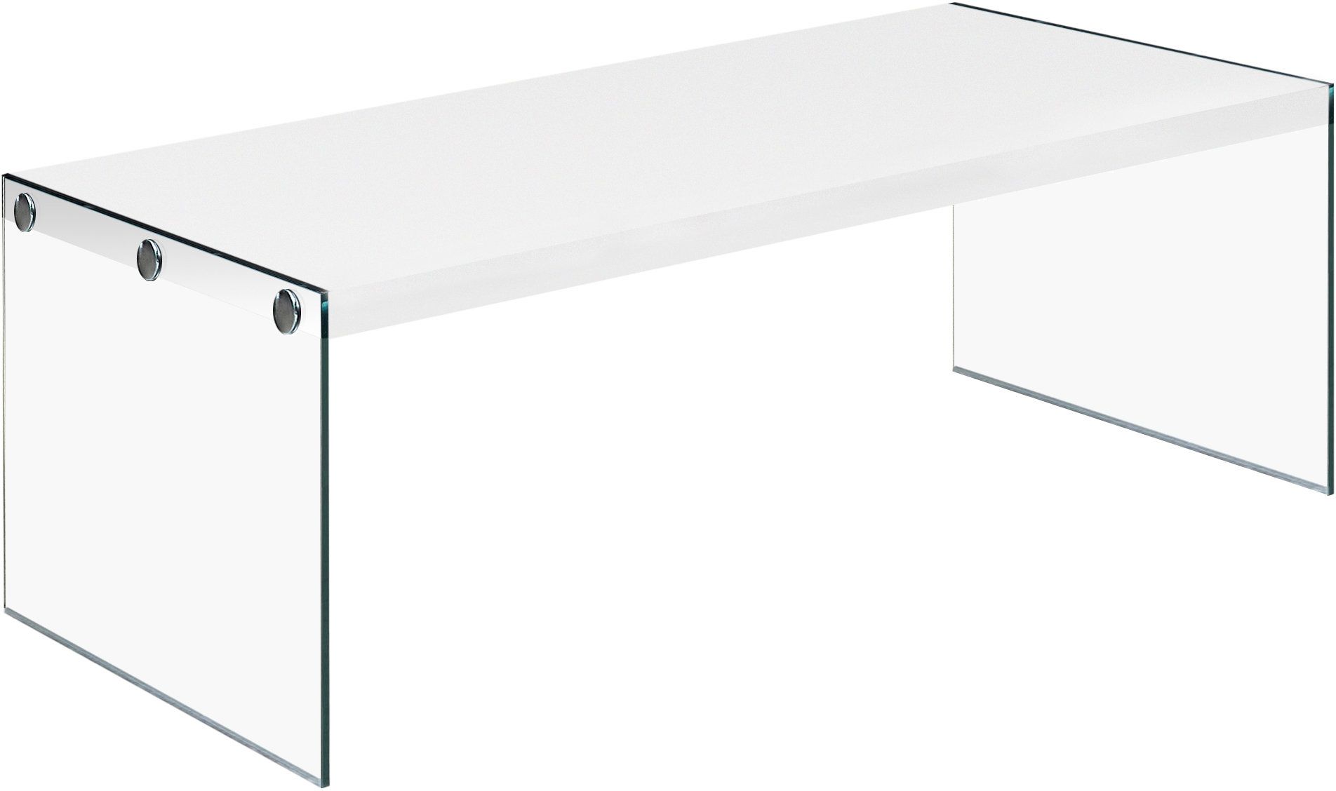 With a sophisticated glossy white tabletop and thick tempered glass sides, this rectangular cocktail table gives an exceptional look to any room. The unique tempered glass base provides sturdy support along with a contemporary styling. This multi-functional coffee table will easily compliment a modern space in a living room, office, den, or family room.