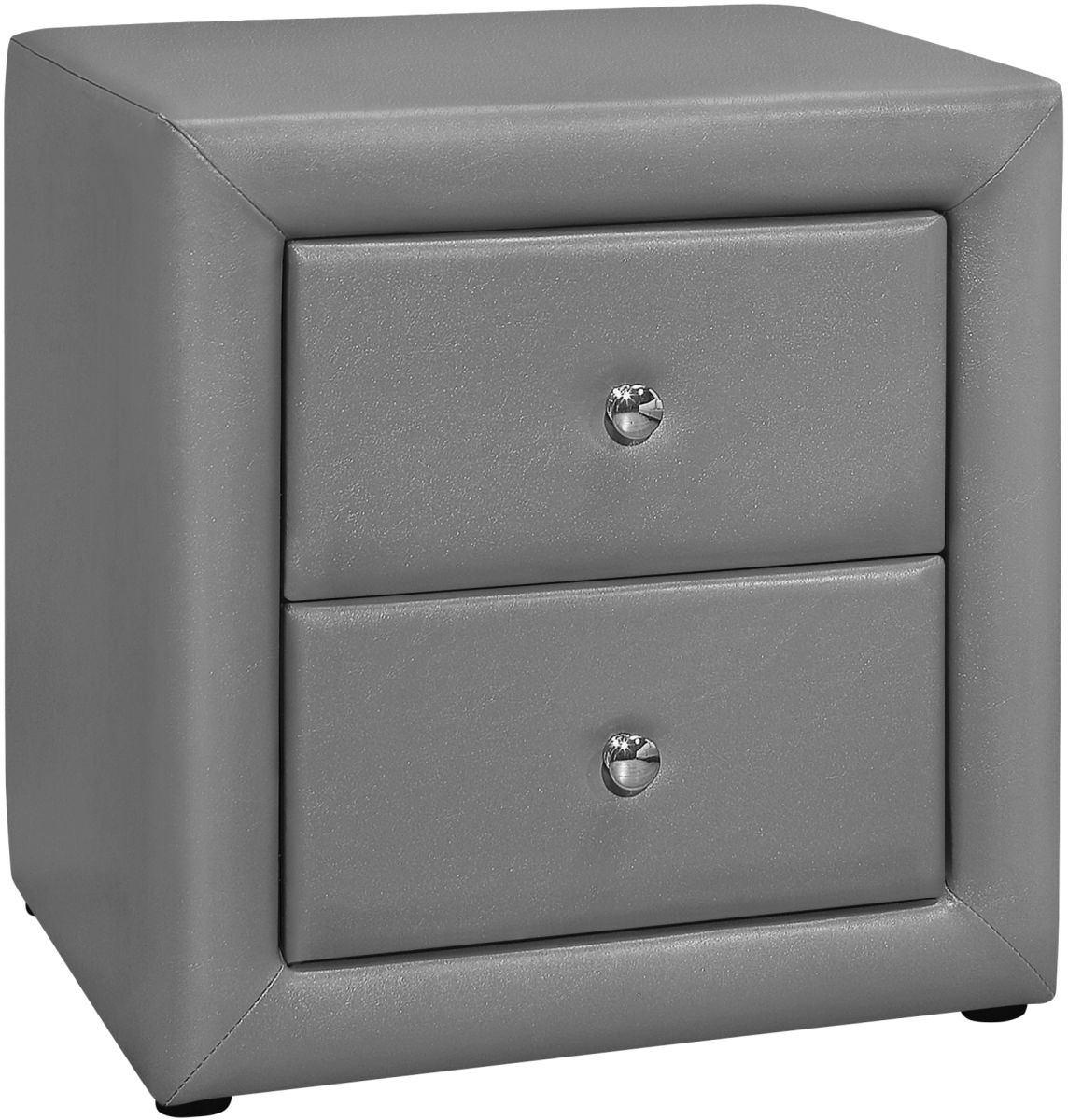 Upholstered in grey leather-look fabric with a chrome-finished metal drawer knob