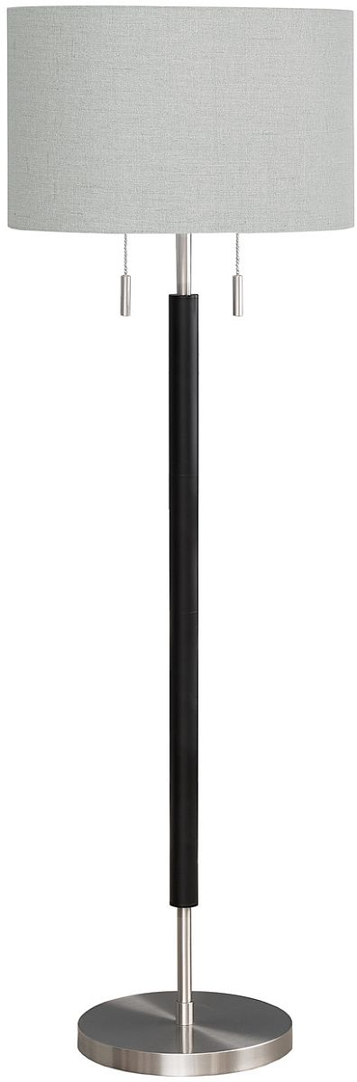 Enliven your space with this modern and sophisticated 60" h floor lamp in black and nickel metal with a chic grey fabric shade. Under the drum shade, this lamp has 2 light sockets that can house two 60W bulbs each (not included) to illuminate a room.Read More