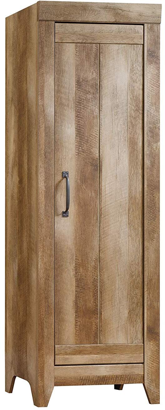 Storage where you need it. This narrow storage cabinet from the Adept Storage collection offers plenty of room for all your stuff and is just the right size to fit almost anywhere. It features three adjustable shelves behind the door so you can stack and stow away towels, blankets, games, books, bins, and more. Finished in a textured Craftsman Oak, this cabinet will hide your clutter and add some carpenter-inspired style wherever it stands.