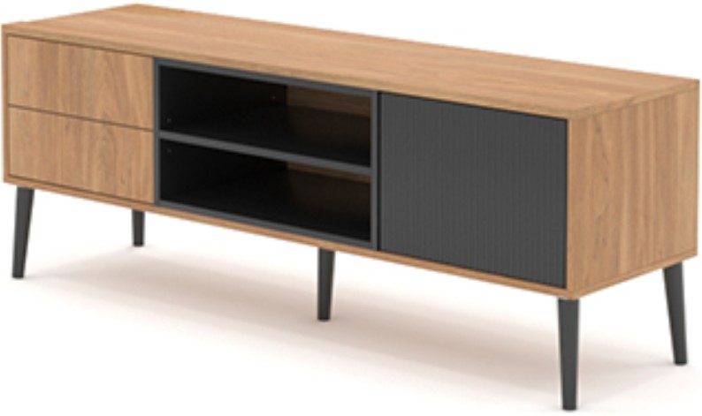 So, it’s perfect for entertaining all your family (or friends) with a movie night, watching the game, or binge watching a popular series. This credenza TV stand includes two doors allowing you to hide away anything you want to keep out of sight. One of the doors features a geometric, fluted design that enhances that modern vibe. An adjustable shelf in the center console of this TV stand with open storage provides a place to hold electronic components or maybe framed photos or other household décor. An enclosed back panel has cord access to channel those electrical cables to the outlet. Detailed with decorative feet and finished in a warm Serene Walnut™ finish with black accents, this stylish entertainment credenza will have your home looking anything but ordinary.