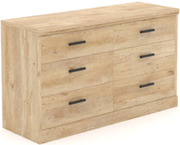 This bedroom dresser features six spacious drawers that open and close on smooth metal runners, perfect for storing the fluffiest flannel pjs and thickest sweaters, or extra bed sheets and thick, soft, downy blankets. The sturdy and spacious surface of this double dresser gives ample room for home décor, photographs, jewelry boxes, or a collection of perfumes. Old-fashioned drawer pulls are a thing of the past with this farmhouse style dresser featuring contemporary, black hardware. Use this dresser with drawers in any bedroom of your home or even the hallway as a stylish buffet or entryway feature. The bright and neutral Prime Oak® finish brings a brightened look of freshness, breathing life into any design.