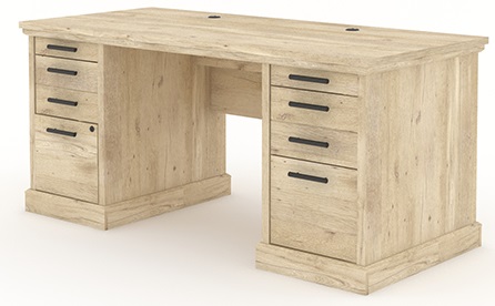 Desks have become an essential addition to the home. With the executive computer desk from the Aspen Post® collection, style and function are combined into one grand desk. The top of this home office desk features strong and lightweight 1” panel construction so you can trust it to support your books, while also being light enough to easily rearrange your home office. This computer desk with drawers features two smaller pencil drawers and two medium size storage drawers to hold spare paper, pencils, binders and more. Two lower file drawers with full extension slides hold letter, legal or European size hanging files so your most important documents are organized and easily available. The left file drawer also features a lock for security and peace of mind. This executive desk with storage features a cord management system with two desk top grommet holes to keep your cords tidy and out of sight. Featuring quick and easy assembly with patented T-lock drawer system, assembly and set up of this item will be a breeze. Finished in a light Prime Oak™, this wood home office desk adds the ideal amount of stateliness and function to create the ultimate home office.