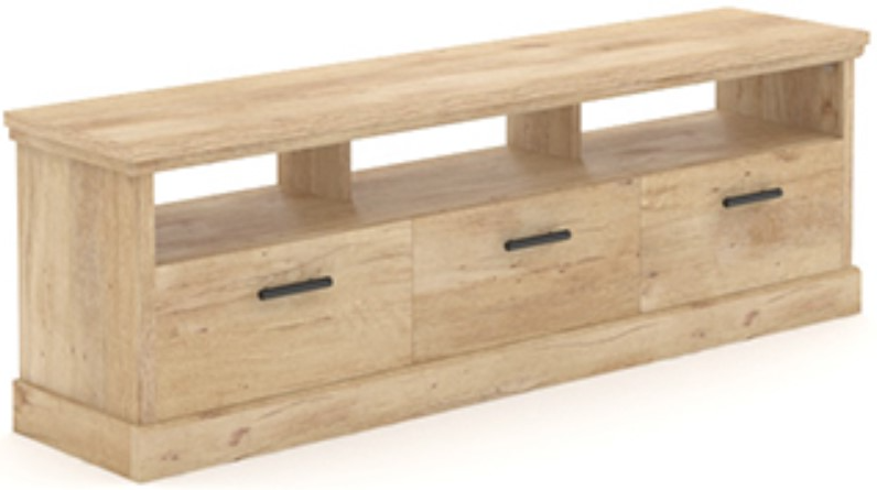 This TV credenza with storage also features three large cubbies with space for DVD players or game consoles, and three drawers with metal runners and safety stops for easy opening. The drawers offer plenty of room for storing video games, movies and more! You will have this TV credenza up and running in no time with quick and easy assembly, featuring slide-on moldings and a T-lock drawer system. The stylish, dark hardware of this credenza TV stand pops against the light, soft tones of the Prime Oak® finish. The neutral tones will blend easily with your home décor, offering both style and function for any room in your house.