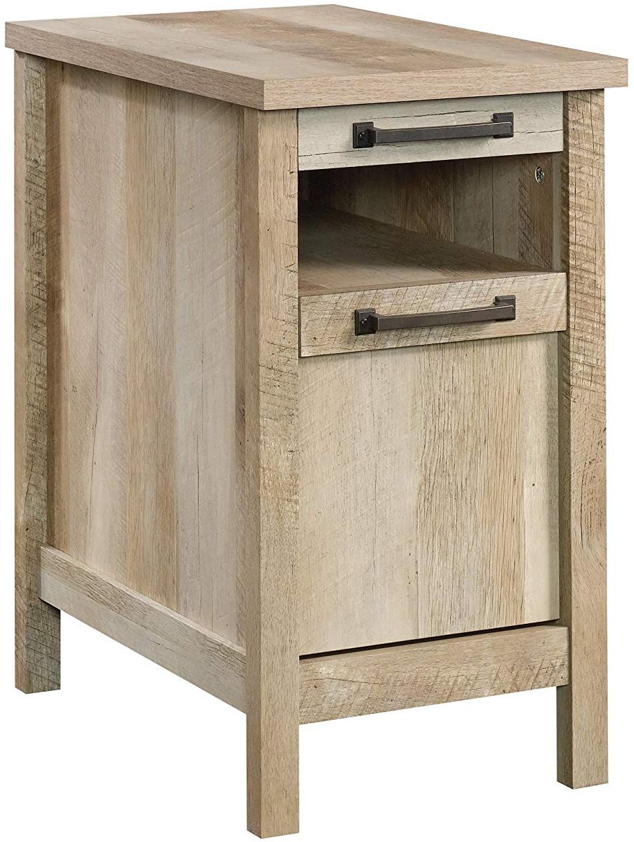 Enjoy a classic look with vintage appeal with this side table from the Cannery Bridge collection. This end table features an open shelf and pull-out shelf for storage along with an easy-to-access drawer for all your other storage needs. Clad in repurposed Lintel Oak accompanied by custom hardware, this end table provides modern functionality for any room in your home.