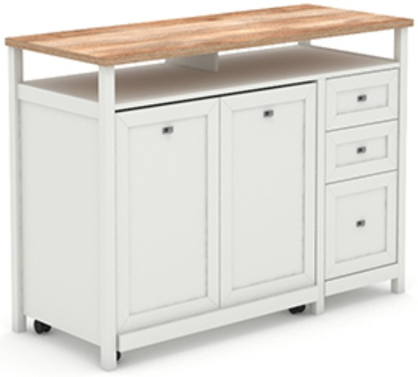 The faux door fronts revel a hidden roll-out work surface at standard desk height, instantly turning the guest room into a home office. This TV stand desk combo features three drawers with full extension slides for your work supplies, TV remote, books, and more. The lower drawer of this TV credenza holds letter-size hanging files. A divided shelving space under the top surface allows for easy storage of your audio-video equipment. A durable, 1” thick top accented in Lintel Oak® finish ensures lasting construction for many years of use in your home. Finished in White, this TV stand with desk is the multifunctional addition to your home that saves space while adding functionality that you need.