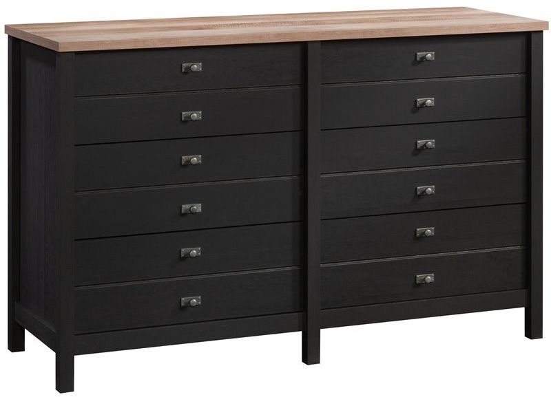 This bedroom dresser features six spacious drawers that open and close on smooth metal runners for easy access storage of a variety of different items: from stacks of slacks and button-up shirts to your collection of leggings and cozy sweatshirts. Each drawer is detailed with attractive hardware that gives it an extra touch of style. The spacious top surface of this double dresser provides you with additional space to store other bedroom essentials and display home décor items like an accent lamp, bottles of perfume, your makeup bag and photos of your family and friends too! Finished in Raven Oak® with Lintel Oak® accent, this bedroom furniture will have you feeling like a storage pro.