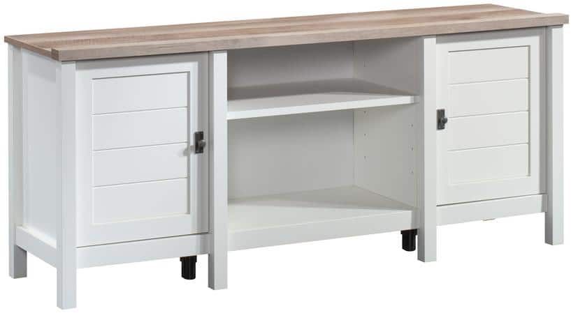 This credenza TV stand features two country-inspired doors that open for hidden storage, revealing an adjustable shelf behind each door. Use this hidden storage area for your video game controllers, extra remotes, DVD collection, and more. This TV stand with cubbies includes a third adjustable shelf in the center open storage area to accommodate items of various heights—like your cable box, video game console, and surround sound system. This entertainment credenza also includes cord management through the enclosed back panel so you can keep all your cords contained. Finished in Soft White® with Lintel Oak® top surface and detailed with beautiful hardware, this farmhouse credenza will be the new centerpiece of your living room.