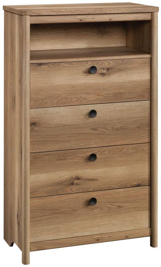This dresser for storage features four spacious drawers with metal runners and safety stops that are ideal for convenient storage of all your favorite wardrobe options like stacks of slacks and your favorite blouses. There is even room for your collection of t-shirts and comfy sweatpants. This 4-drawer chest also offers a spacious top surface that provides you with the perfect amount of space to store additional bedroom items and display home décor like an accent lamp, your makeup bag, bottles of perfume, or photos of your loved ones. An open shelf below the top surface of this dresser with drawers can house the current book you are reading, your reading glasses, and more. Finished in Timber Oak™, this bedroom dresser is the solution to all your storage woes.