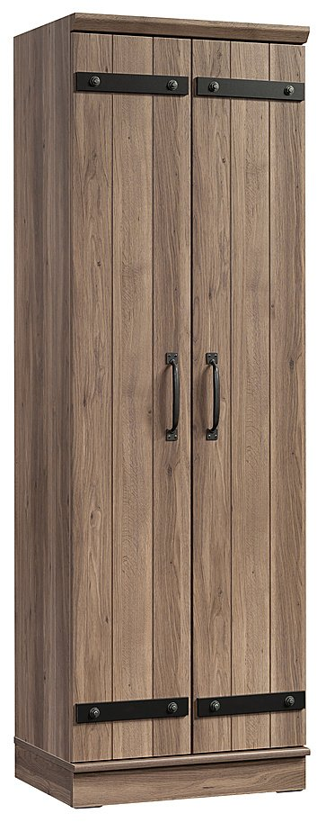 Contain the clutter and chaos of your home with this 2-door storage cabinet from the HomePlus collection. This modern farmhouse storage cabinet features adjustable base levelers to ensure your unit is level, even if the floors are not. An enclosed back panel with cord access pass-throughs allows for easy charging of phones, tablets, computers, and more. Add this two door storage cabinet to any room in your home that needs more store-away solutions—the entryway, hallway, spare room, and more. Finished in Salt Oak®, this piece can even be used as a garage storage cabinet. No matter where it’s placed, it will add style and functionally to any room in your home.