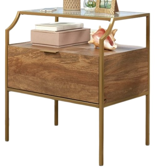 Travel the world and never leave the bedroom with the International Lux® contemporary bedside table. The surface of this modern 1-drawer nightstand is constructed of elegant, safety-tempered glass with metal framing finished in sophisticated satin gold.Read More