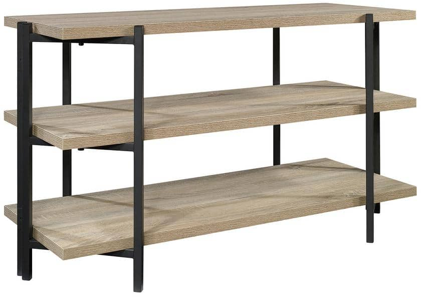 Add a little Rustic elegance and industrial style to your home with this console from the North Avenue collection. It accommodates up to a 42” TV, perfect for watching all your favorite movies and shows. It features a sturdy, 1” thick top and shelves to hold video and gaming components, plants, books and more! Finished on all sides with a powder coated metal frame and Charter Oak finish, this versatile TV stand will look great wherever it entertains.