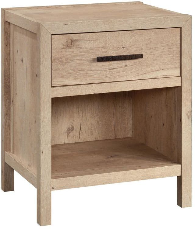 This nightstand with open storage features a drawer with metal runners and safety-stops to provide you with a convenient spot to stow away items like your reading glasses, your collection of crossword puzzles, and the TV remote. This bedside table with drawer also features a lower open shelf for additional storage space of miscellaneous items like books and storage bins. This single drawer nightstand is finished on all sides, meaning it looks good no matter where it stands -- the bedroom, or next to the couch in the living room. Finished in Prime Oak®, this bedside table will put that finishing touch on your bedroom décor and help you contain the clutter for a relaxing, stylish bedroom.
