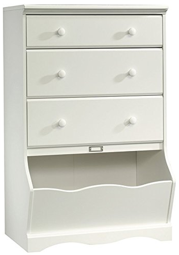 Looking to create some much needed storage for your child’s abundance of clothes and toys? Look no further! This 3-drawer chest from the Pogo collection is just what your child’s bedroom needs. It features three spacious storage drawers that open and close on smooth metal runners, providing you with convenient space to stow away items like your child’s collection of shirts, assortment of shoes, all their favorite jammies and much more! It also features a large storage bin for easy to reach storage of items like puzzles, board games and stuffed animals too! It includes an ID label tag for easy labeling and organization of your child’s belongings. The top surface also provides you with room to store and display anything from books and toys to picture frames and home décor. It is detailed with whimsical curves and a solid wood knob to add an extra touch of fun to your child’s room. Finished in Soft White, this cute dresser is the solution to all your storage woes.