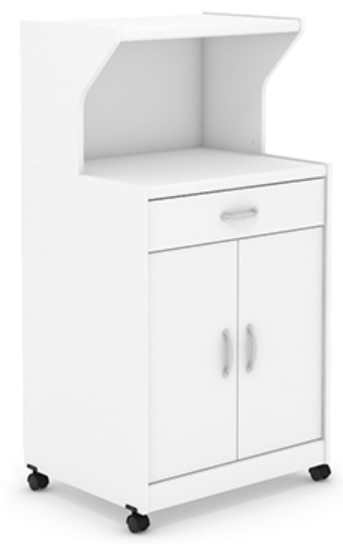 This kitchen cart microwave stand also has a spacious top shelf for additional display and storage of plates, paper towels, décor, and more! This kitchen microwave cart also includes a drawer with metal runners and safety stops to hold essential kitchen or pantry items. The lower hidden storage area behind the doors features an adjustable shelf for storage of other kitchen gadgets or extra cereal boxes. Dual-wheel casters for easy mobility allow you to move the cart from room to room, or corner to corner, depending on your needs. An enclosed back with cord access allows for easy pass through to avoid cord clutter. Assembly is quick and easy with a T-slot drawer system. Finished in Soft White®, this multifunctional, white microwave kitchen cart will have you organized in no time.
