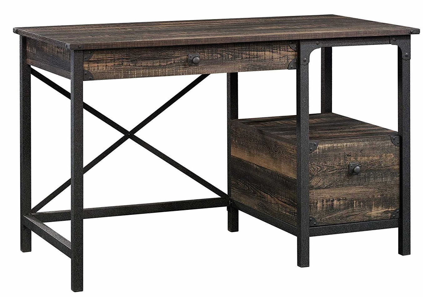 Rustic-inspired style is just what you need to get motivated for your next big project. Update your home office or workspace with the one-of-a-kind design and beauty of this desk from the Steel River collection. Its spacious top surface provides you with the room you need for all your desk essentials like your laptop, a cup full of pens, a stack of notepads and of course your coffee mug. It also has room for items like picture frames and knick-knacks too. This computer desk features two drawers that open and close on smooth metal runners. The pencil drawer is ideal for easy access storage of items like pencils, paper clips, and rubber bands. The large lower drawer is great for storing books, magazines, and other miscellaneous items. It also includes an open shelf for additional storage space. This home office desk features a textured, powdercoated metal frame and rear crossbars for stability. Finished on all sides in Carbon Oak, this handsome office desk is just what you’ve been looking for.